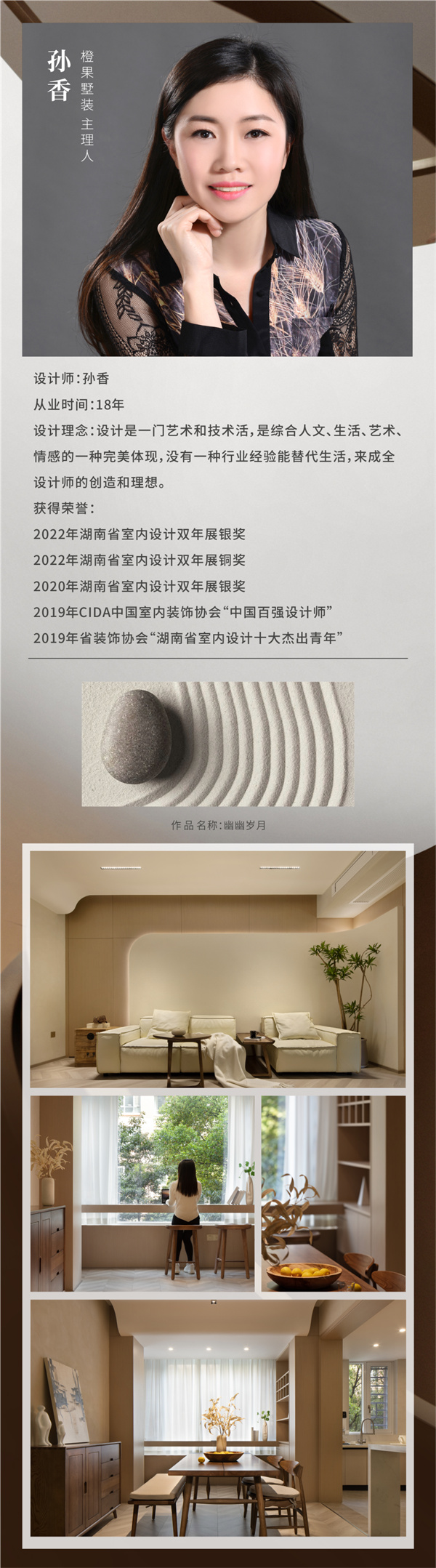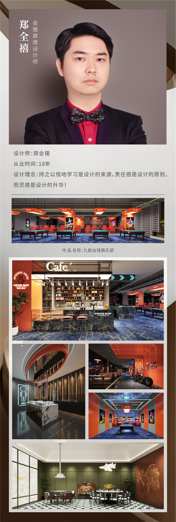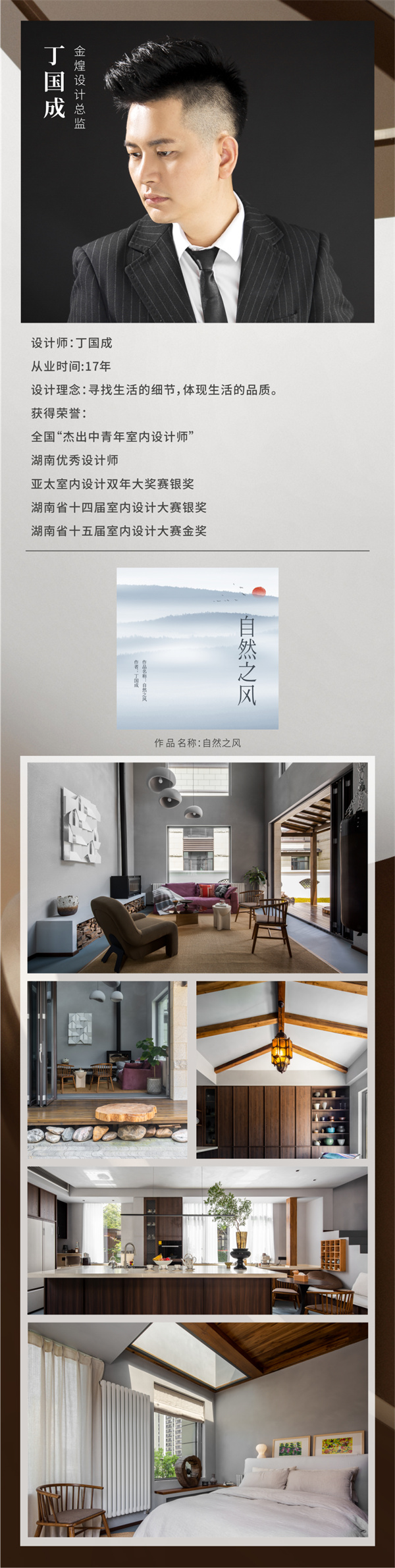 本次大赛以“绿色潇湘·幸福湖南”为主题,金煌设计总监丁国成设计的住宅项目《自然之风》,金煌TOP设计院孙洁设计的麓云国际别墅项目获得金奖;金煌首席设计师郑全禧设计的会所项目九韵台球俱乐部获得铜奖;孙洁设计的住宅项目《映•槿》获得优秀奖。橙果墅装主理人孙香设计的住宅项目《幽幽岁月》获得金奖,《明暗至简》获得铜奖。金煌也喜获优秀组织奖。