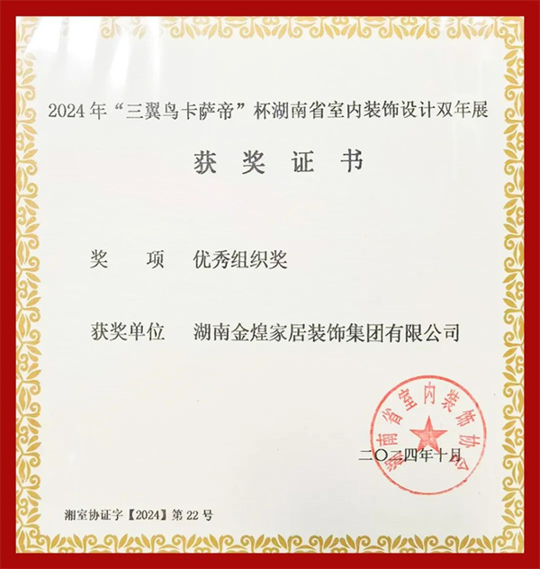 日前,由湖南省室内装饰协会主办、协会设计专业委员会、各市州室内装饰协会和相关院校承办,海尔智家湖南分公司协办的2024年 “三翼鸟卡萨帝”杯湖南省室内装饰设计双年展颁奖典礼在长沙举行。金煌满载而归,共斩获3个金奖、2个铜奖、1个优秀奖。