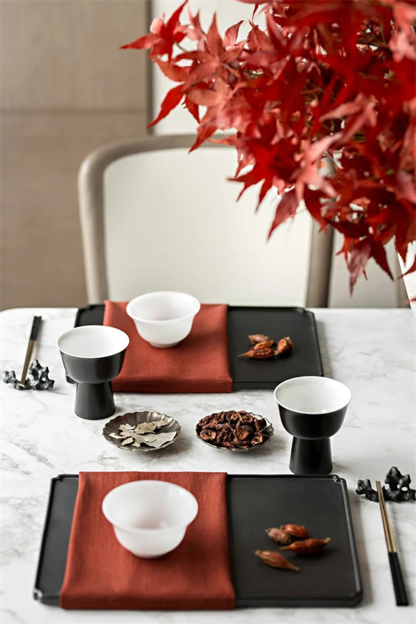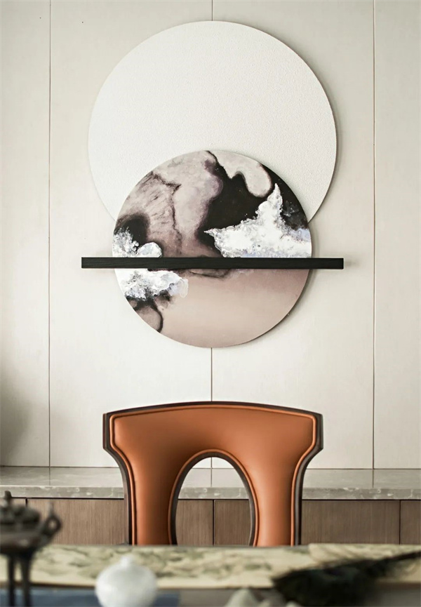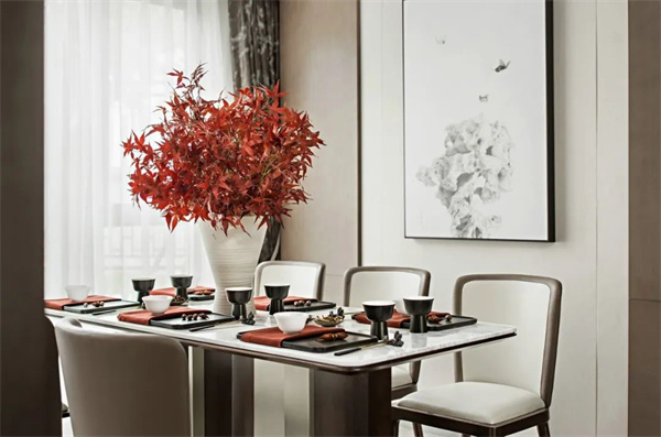 新中式餐厅布置,以天然材料的运用、色彩搭配的细致处理以及家具的精心选择,使餐厅呈现出舒适、高品质的用餐环境。背景墙上挂上一幅古韵山水画,增加空间质感,充满了禅意的韵味。
