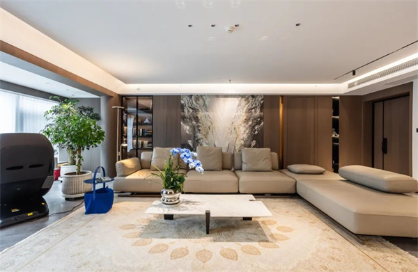 客厅简洁干净的布置,温润、素雅且低饱和度的色彩搭配,让整个空间充满高级的温柔感。