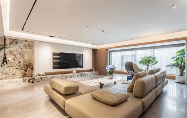意式轻奢客厅以豪华和舒适为特点,注重细节和艺术品味。大理石地砖和墙壁饰面营造出高贵的氛围,与暖色调的墙壁相得益彰。