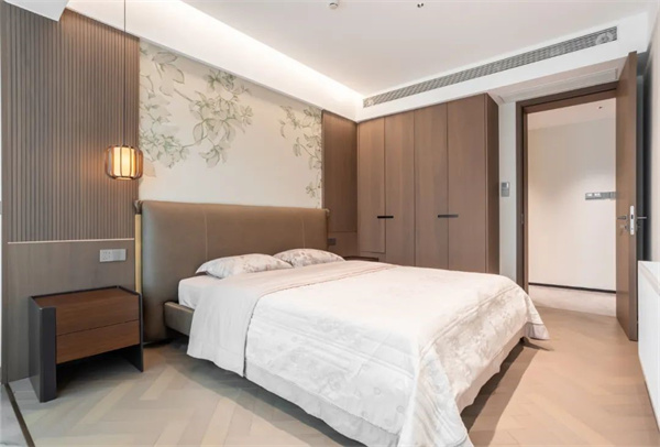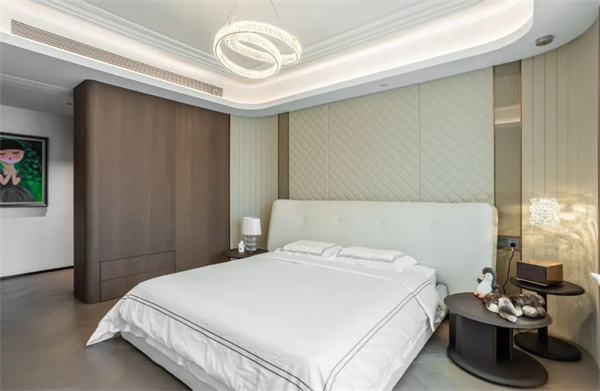 卧室的设计上用了简约的线条为核心元素,意式轻奢风在讲述真正的永恒经典,柔软的床和精致的床头装饰营造出豪华的感觉,搭配丝绸质地的床品和柔和的色彩,营造出温馨而舒适的睡眠环境。