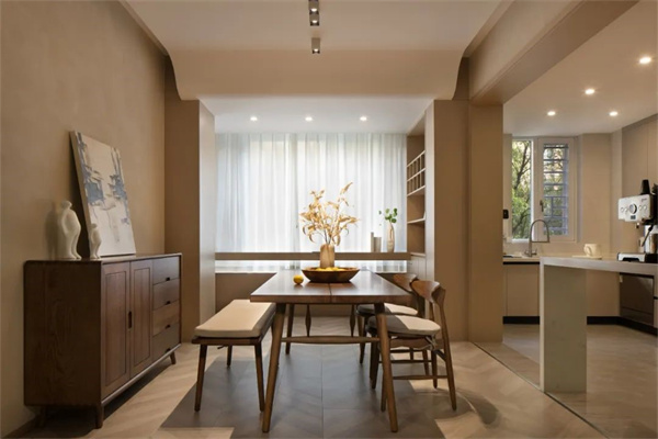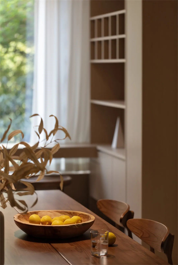 餐厅的设计同样延续了侘寂的美感。原木色的餐桌搭配简约的椅子,没有多余的装饰,只有一束采自院子的不知名花草,显得朴素而自然。
