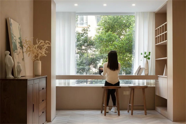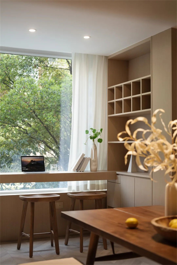 阳台纳入客厅,靠窗的一边设计有书柜、书桌,空间足够收纳书籍和杂物。书台上的绿植显得格外清新素雅,稚嫩的枝丫,呈现出别样的东方韵味。
