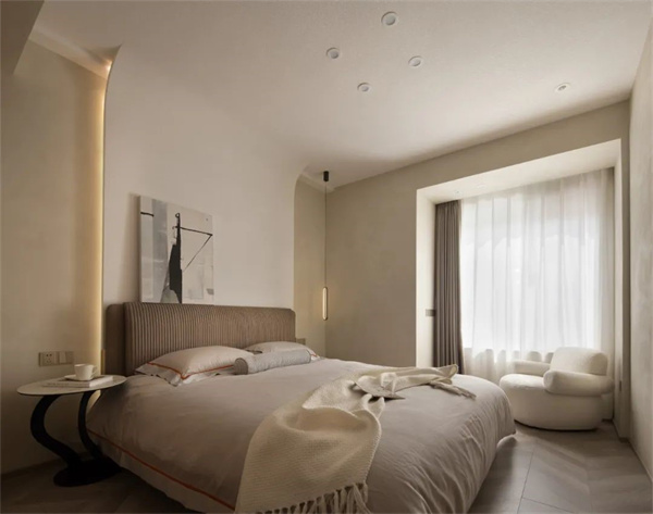 卧室设计持续自然舒适的格调,流畅的线条让整个空间变得更加流畅和富于层次,展示出整个空间的理想状态。床上用品都是以淡雅的色调为主,再配以柔软的质地,让人感受到安逸与宁静。