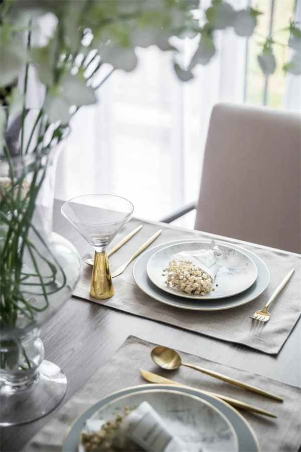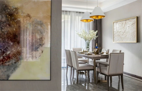 餐厅以浅色为主调,中央摆放着一张长方形仿木质纹理的餐桌,桌面光滑细腻,散发出低调的奢华感。上方悬挂着一盏华丽的水晶吊灯,搭配桌上精心布置的金色餐具、细瓷餐盘以及充满自然气息的鲜花,营造出温馨而浪漫的用餐氛围。