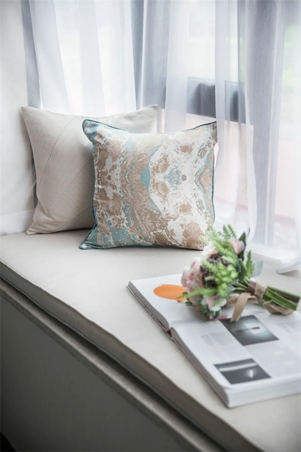次卧以柔和的浅灰色和象牙白为主色调。床上铺设着柔软的棉麻床品,搭配着几只丝绸抱枕,带来舒适而奢华的触感。大窗户配有轻纱窗帘和厚重的绒布窗帘,既能保证充足的光线,又能在需要时提供私密性。