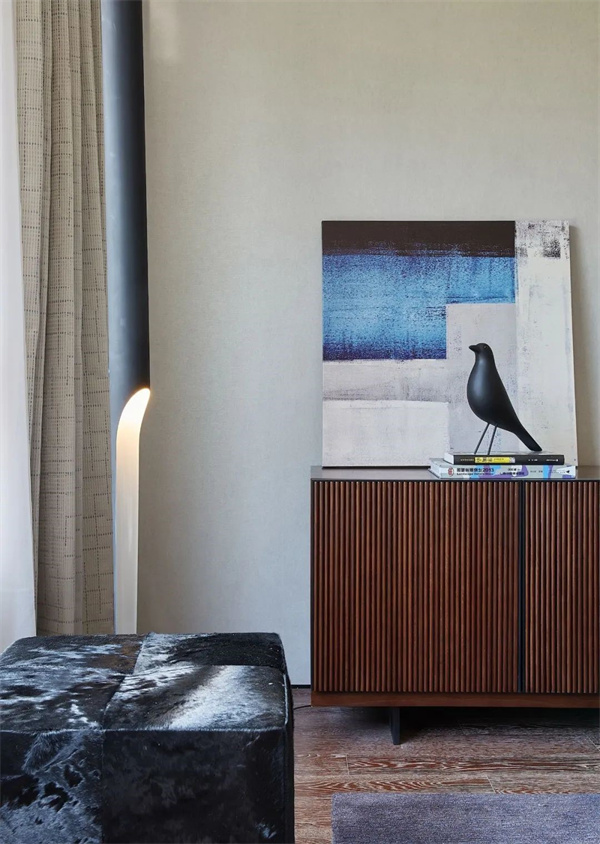 走进书房,被一整排书柜所吸引,大量艺术摆件展示主人品味与艺术素养。加上大量使用的橙色元素,使整个空间更加充满活力和生机,每一处细节都在呼应着整体的设计理念,既独具特色又不失和谐统一。