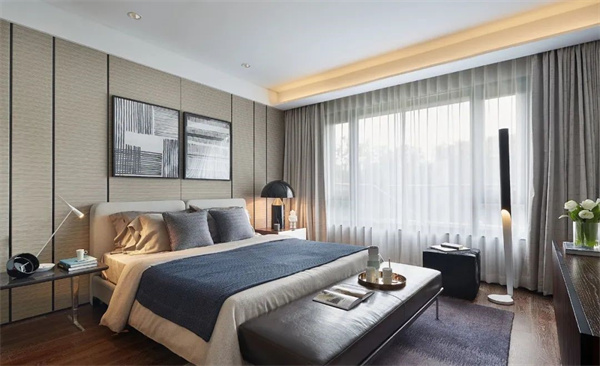 卧室床头墙是软质的布艺靠背,整体以灰、白色为基调,加入一组布艺画点缀,带来一种温暖而又优雅的氛围。床品选用了高品质的纯棉面料,柔软舒适,令人沉浸在舒适的睡眠中。
