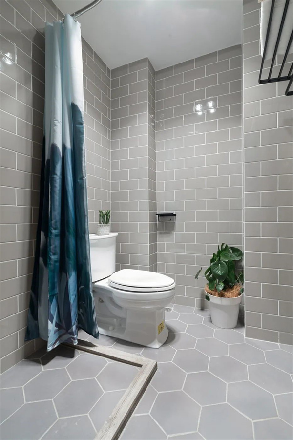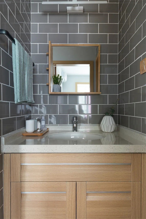 卫生间采用灰色墙砖,搭配直线条设计的洗手台和镜子,营造出干净明亮的视觉效果。淋浴间采用了较经典实用的二式分离设计,加上置物架设置,增强卫生间的收纳效果。
