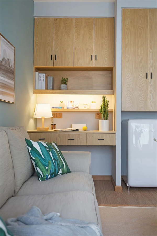 转角处,做开放式书房设计,以木质书桌和书架为主,温暖的木纹与清新的色调相互呼应,营造出一个可以放松思绪、感受自然气息的角落。