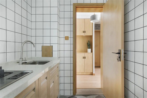厨房的网红小白砖让人眼前一亮,木质橱柜与白色大理石台面相结合,既实用又富有现代感。定制化橱柜设计简洁而大方,增添一抹自然的美感,营造出一个既实用又舒适的烹饪空间。