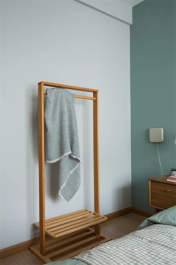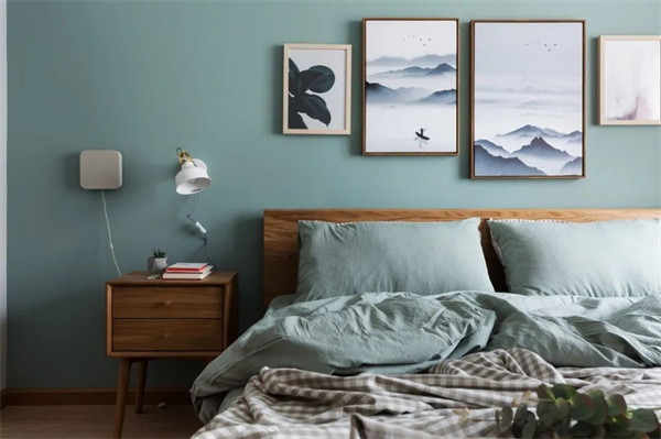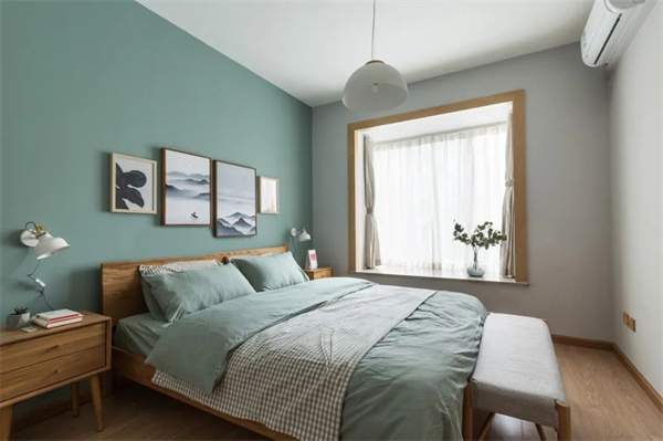 主卧以淡绿灰搭配天然木质的艺术挂画作为床头背景,配合同色系的床品,带来一种柔和的舒适感。原木床架质朴而富有质感,与淡绿灰的床品组合在一起,呈现出一种轻松自然的协调美。