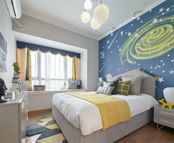 儿童房的设计理念中,简约并非剥夺趣味。柔和的蓝黄色组合是主导色调,搭配原木色家具,保留了童真的活泼感,同时呈现现代简约设计理念。简洁而有趣的壁纸和可爱的软装为儿童房注入了生气和活力。