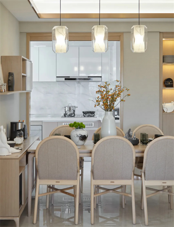 餐厅空间与客厅相连贯,整体宽度充足,居中摆放一套简约舒适的木质餐桌椅,让用餐氛围轻松闲适。一旁的餐边柜设计,兼具了装饰与收纳功能,让空间更加整洁协调。