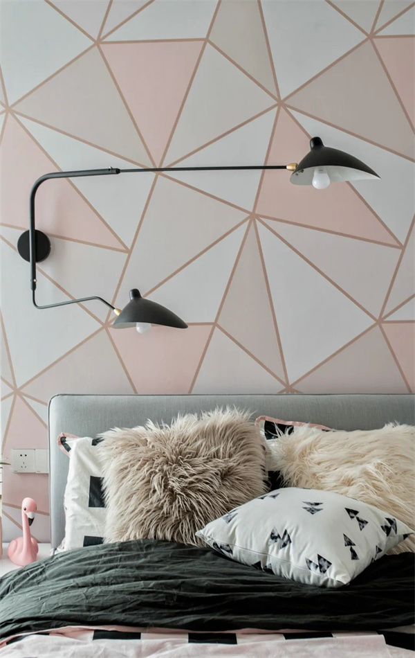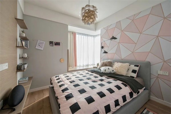 主卧背景墙采用丰富的拼色设计,原木地板、暖色床品、软装挂饰完美搭配,营造出宁静淡雅的睡眠环境。在简约温暖舒适空间中,床头的小台灯在夜晚照亮属于自己的小天地。