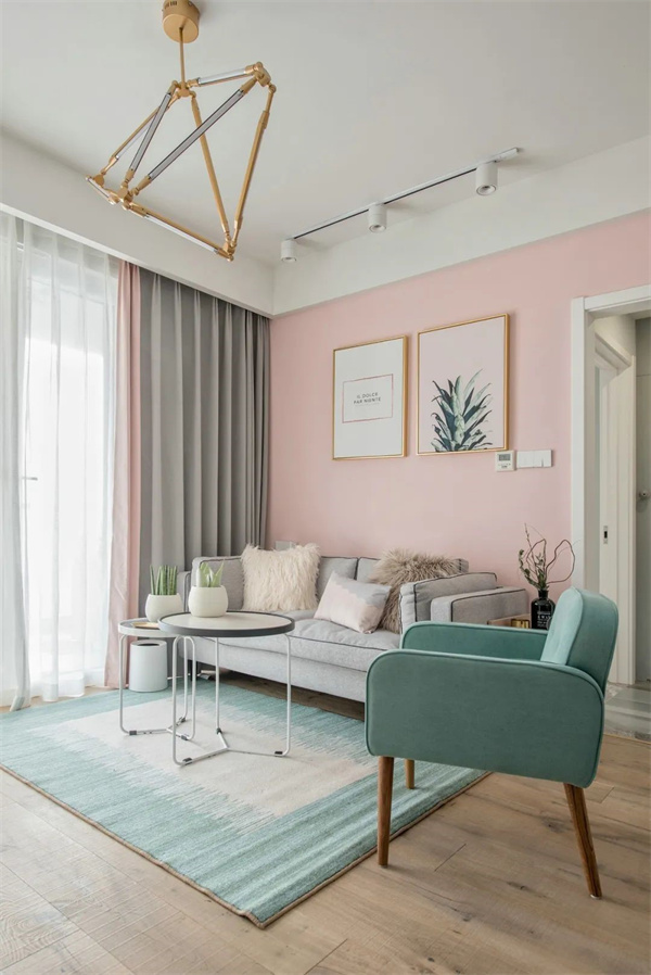 客厅墙壁采用粉色和天蓝色的巧妙组合,这种色彩搭配不仅增添了空间的层次感,还带来了一种温暖与宁静的对比美,两者相互映衬,营造出一种既温馨又清爽的视觉效果。