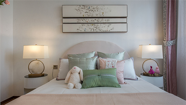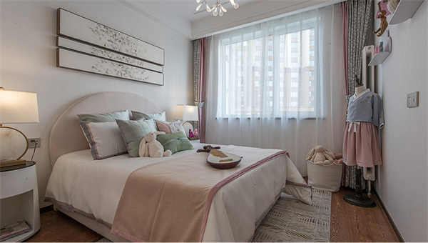 儿童房的装修以粉色为主色调,搭配暖白底色,整体呈现出温婉秀气、灵动静雅的氛围。床的背板上方挂着中式水墨画的简约装饰,透露着青春的气息,为空间注入了生机勃勃的活力。