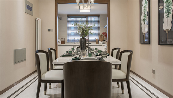 餐厅的位置紧邻着厨房,这样可以方便地将美食直接送到宾客的餐桌上。以棕色原木餐椅搭配绿植和水墨挂画来装点空间,营造出一种温馨舒适的氛围,让主人能够在此款待来宾,享受美食和美好时光。