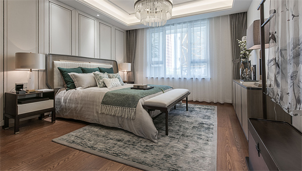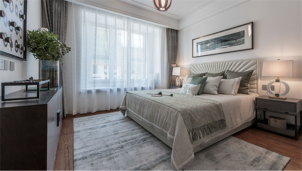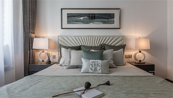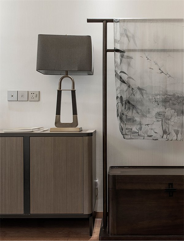 次卧的设计聚焦于打造使人精神愉悦的氛围,通过简化设计元素、摒弃过多复杂和陈旧的装饰,使空间更加简洁清新。在细节中融入中式设计元素,营造出自然温馨的空间感。