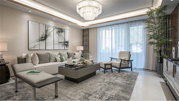 客厅中,新中式风格融合传统文化和现代设计,巧妙地将两者相结合。经典的木质家具搭配现代简约的沙发,打破了传统与现代的界限。大面积的落地窗将自然光线引入,让整个空间更加通透明亮。