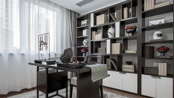 书房呈现出新中式的独特风采,整体设计注重空间的布局和家具的选材。沉稳的木质书桌与原木书柜展示了东方文化的深厚底蕴。书桌上的文房四宝、书柜上的古典书画和瓷器既点缀了空间,又表达了主人对传统文化的热爱。