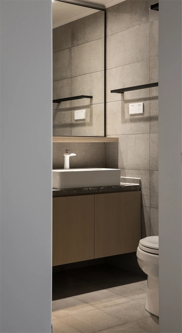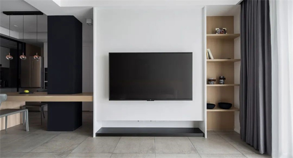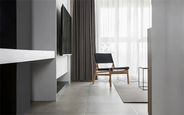 客厅设计以黑、白、灰的主色调为基础浅云白的墙面营造出通透感,灰色瓷砖地面搭配原木色饰面打破单调 ,赋予空间层次感。天花顶面装上筒灯,再明装导轨射灯配合灰色调软装布置呈现出一种极简大方的空间感。