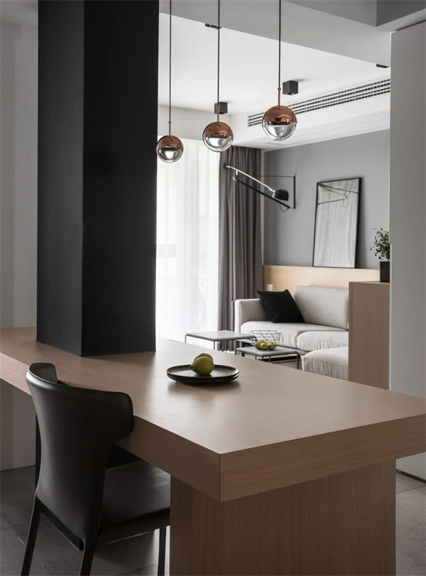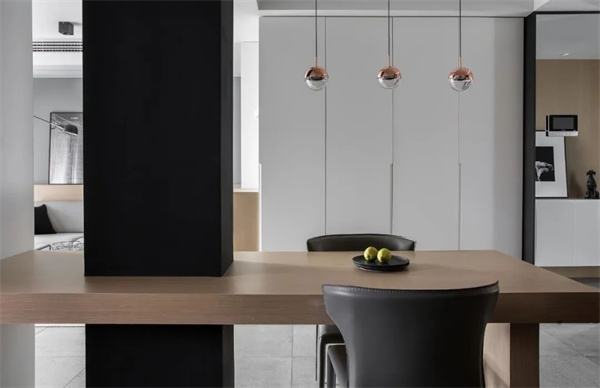 黑、白、灰的装饰元素在餐厅中得到了精致展现。白色的墙面与灰色地砖组合,简约高级的原木餐桌搭配深灰色皮质餐椅,呈现出现代感与温馨感的完美平衡。