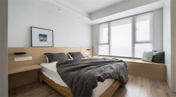 主卧空间以原木地板为基调,搭配白色墙面与灰自组合的床品,打造出简约而不失品位的氛围。选择原木饰面的家具,与整体设计风格保持一致,让主卧成为一个宁静而舒适的私人空间。