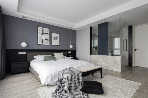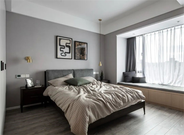 主卧室以灰色为主,地板+墙面、包括床上用品都采用了白+灰组合。床头柜和背景的灰黑组合,为空间增添了一些深色元素。窗帘选用了白色透明面料,确保充足的自然光线进入房间。