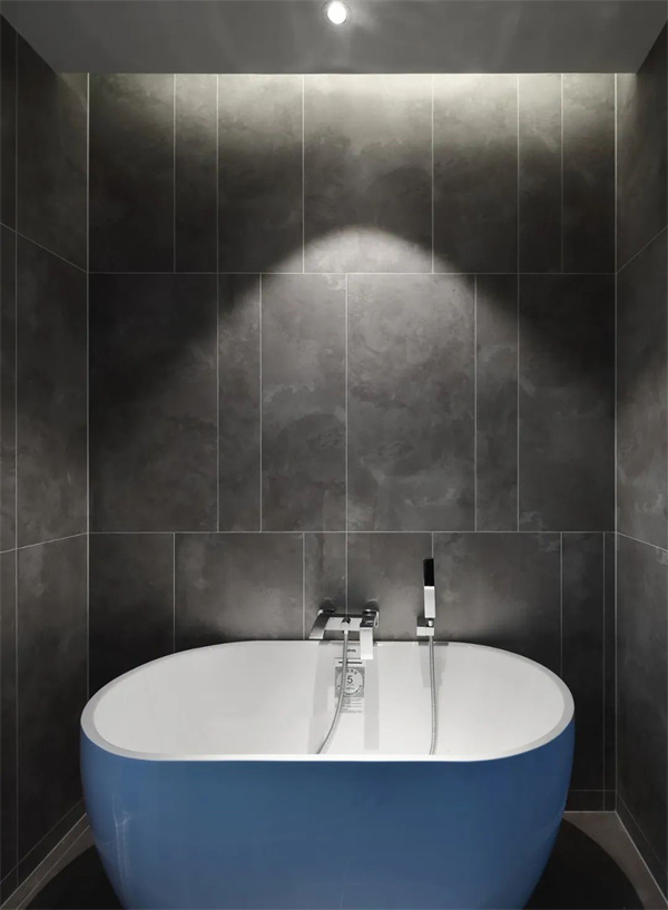 卫生间的洗手台设计简约,搭配定制储物柜,采用中性色调,为业主提供收纳空间的同时维持整洁。浴缸采用独立式设计,周围点缀着灰色瓷砖,强调了空间的纯粹与线条感,完美融合了日常实用性和美学价值。