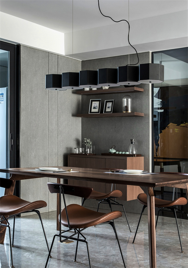 餐厅以简洁的桌椅设计为主,原木餐桌搭配时尚皮质餐椅,创造出轻松宜人的用餐氛围。独特设计的吊灯成为视觉焦点,突显现代感,整体设计追求空间感和开放感,用餐成为一种令人愉悦的体验。