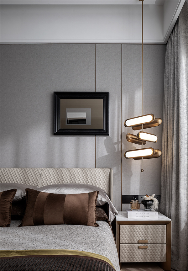 主卧空间散发着一种优雅与舒适并存的氛围质感。柔软的床和精致的床头背景设计,营造出轻奢质感。床头摆放着精美家居饰品,暖色的台灯搭配装饰画,增添了空间的雅致感。