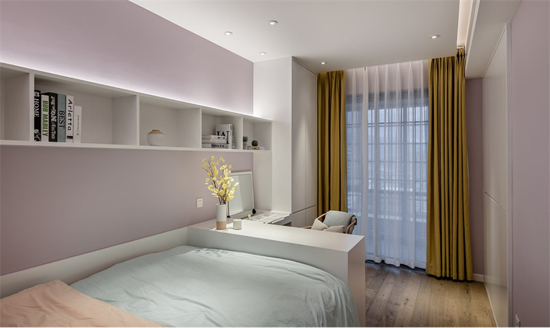 儿童房采用粉色+白色组合做主导色调。房间一角设计了L型书桌和椅子,既节省空间又功能齐全,为孩子提供了理想的作业和学习区域。书桌上摆放着装饰品和书籍,体现了主人对细节的关注与品味的追求。
