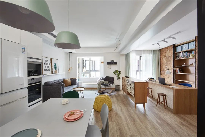 餐厅延续了客厅的设计,使用白色和灰色为主要色调。餐桌采用了简洁的灰白色设计,配合原木色地板,为用餐区带来了舒适感。顶部悬挂着一组现代感的吊灯,为餐区提供了柔和的照明
